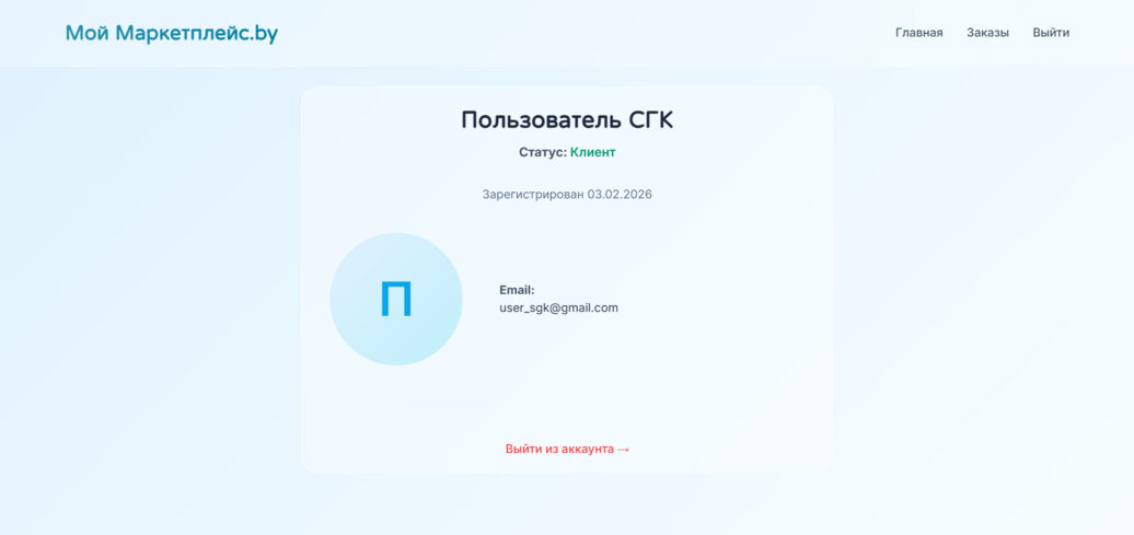6. Страница профиля При нажатии на ссылку "Профиль" с авторизованным аккаунтом происходит переход на страницу профиля. Здесь отображается вся доступная информация аккаунта.